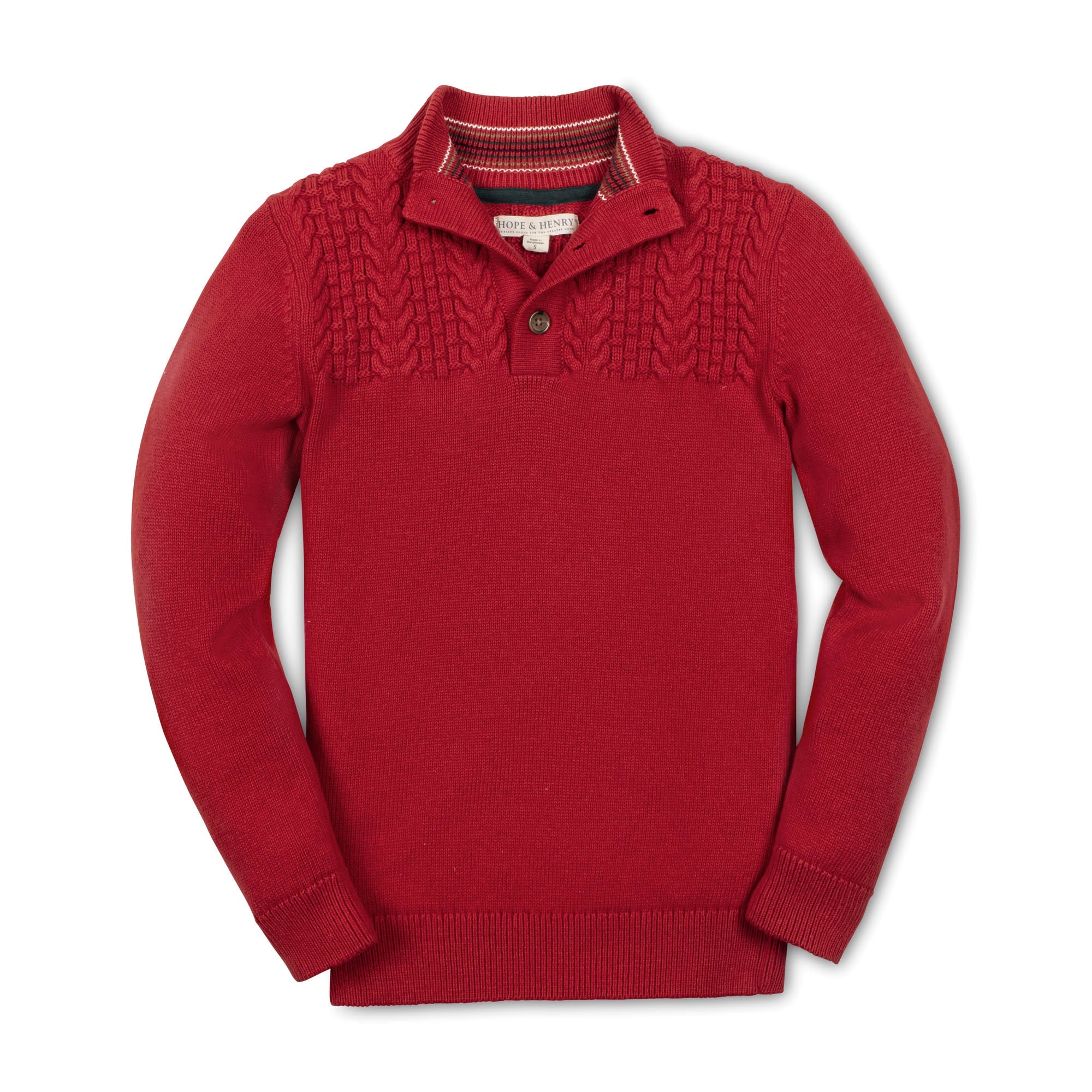 Our mock neck sweater in soft organic cotton lends an instantly polished look for your boy. Features a beautiful cable knit design at the shoulders, stripe collar trim, and a button front placket. Pairs nicely over our collection of organic cotton button downs and polos. An instant classic.