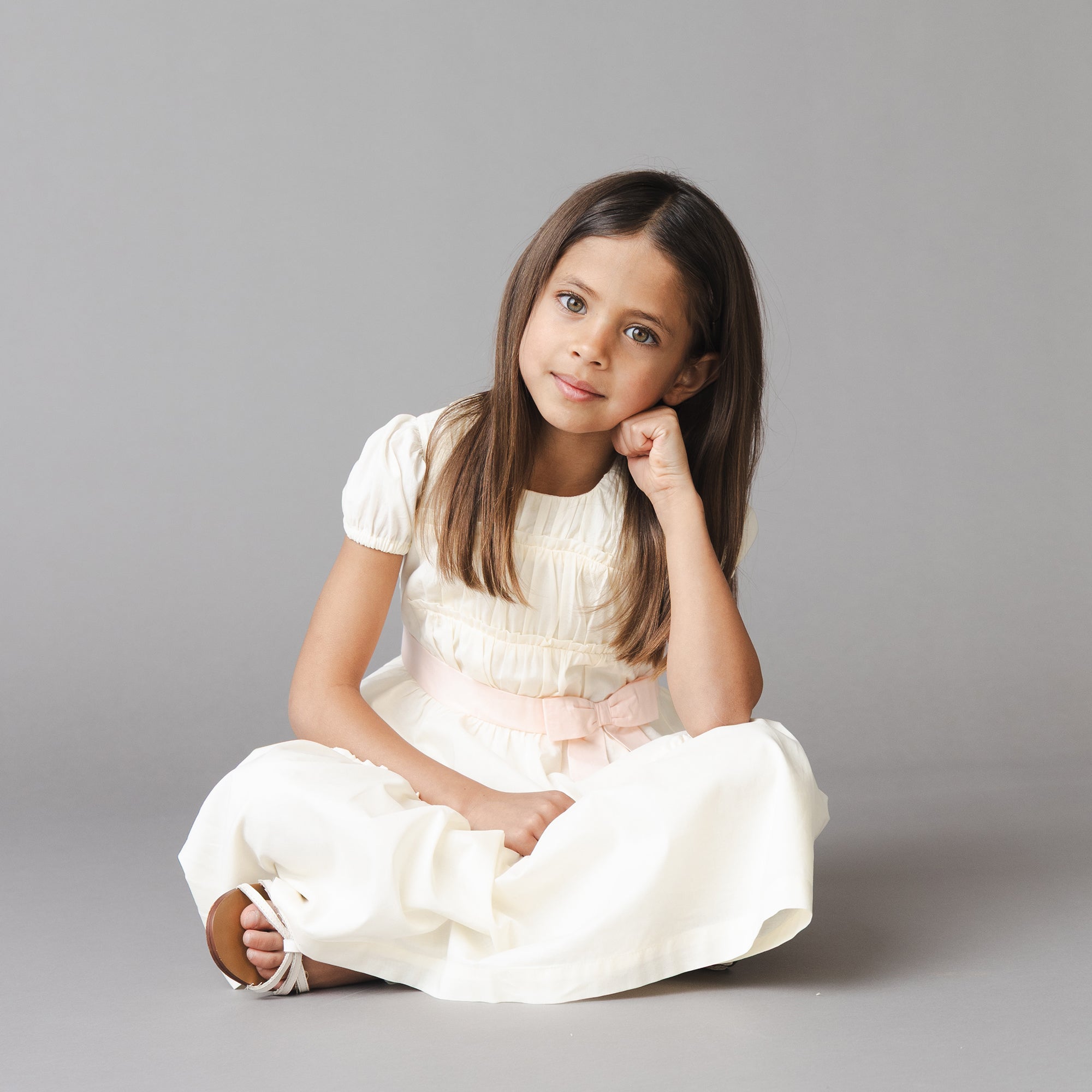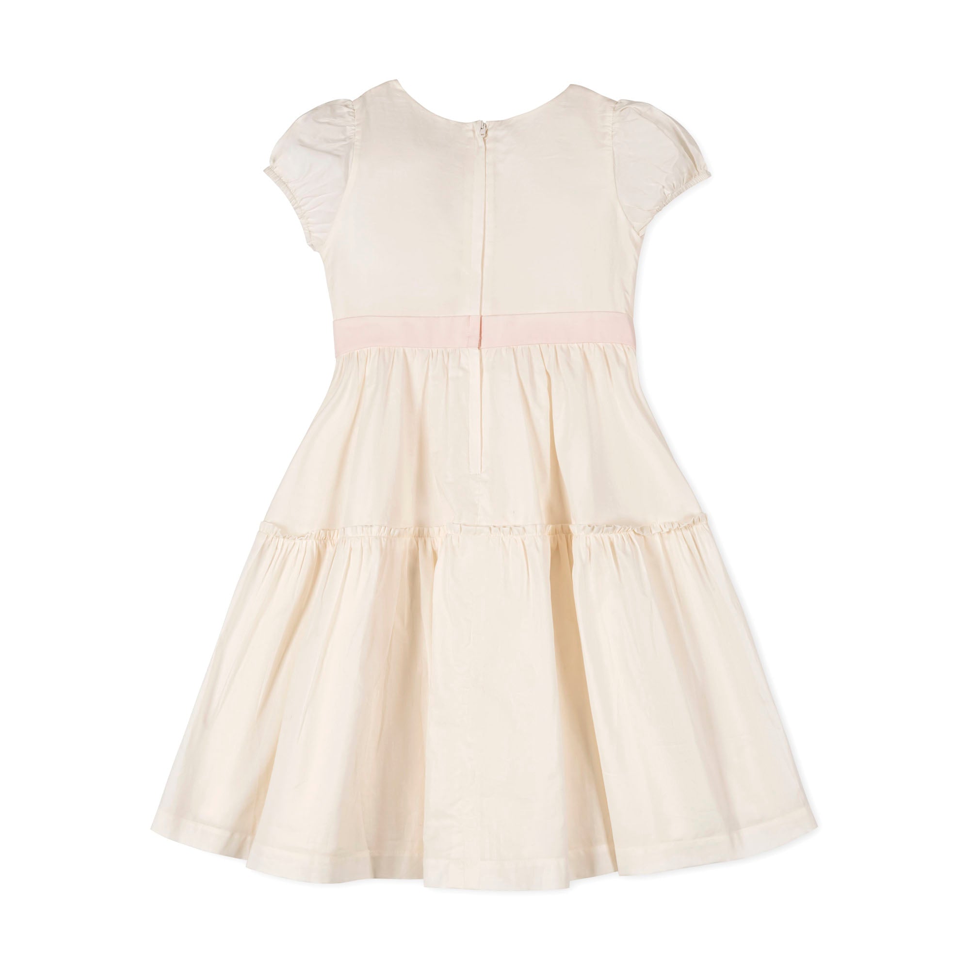 Our stunning party dress will have your girl ready for all of spring's special occasions. Cut from a light and soft organic cotton, this flattering piece features feminine puff sleeves, a tiered twirly skirt, waist sash with bow, and a zipper down the center back for easy dressing.