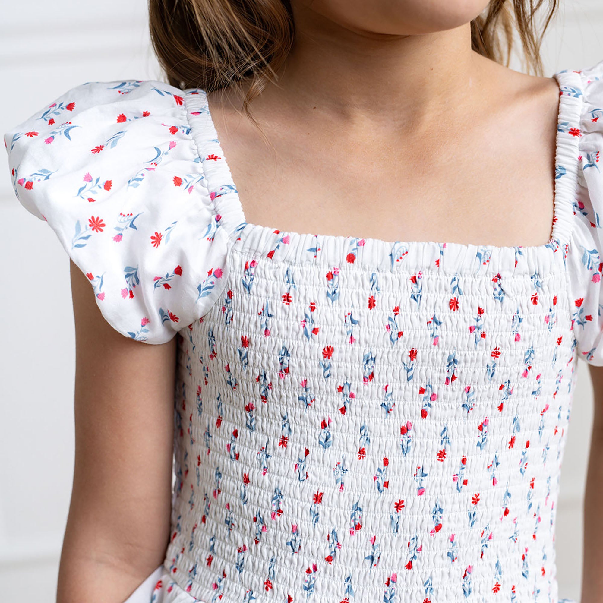 Pretty puff sleeves add a special touch to our summer romper crafted from a beautifully lightweight organic cotton. Features a ruffle at the waist, side pockets and stretchy smocking at the bodice for a comfortable fit. Fully lined in soft organic cotton. A perfect piece for picnics and parties alike.