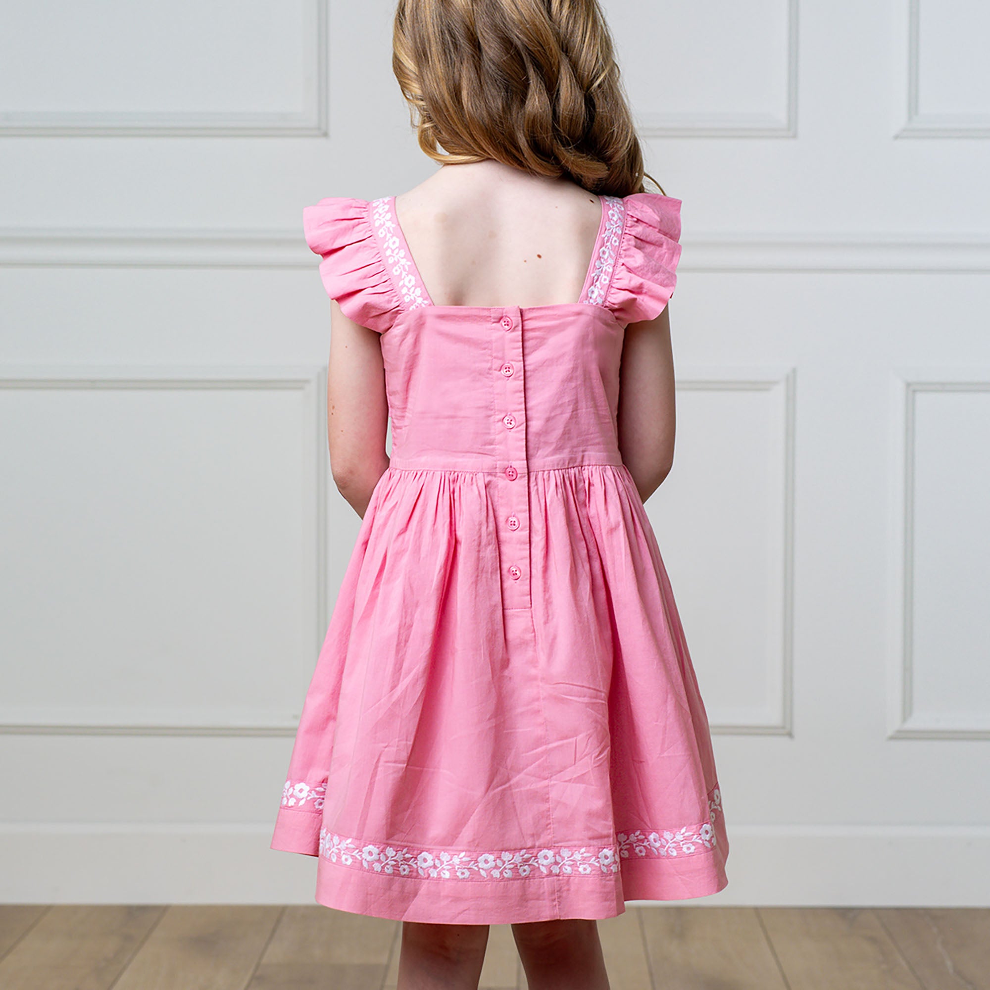 Our beautiful pleated apron dress in soft organic cotton is perfect for summer days and special occasions. Features flutter sleeves, patch pockets, a pleated bodice, and floral embroidery at the hem and shoulders. Fully lined in organic cotton with a button closure down the center back. Perfect for everything from picnics to parties.
