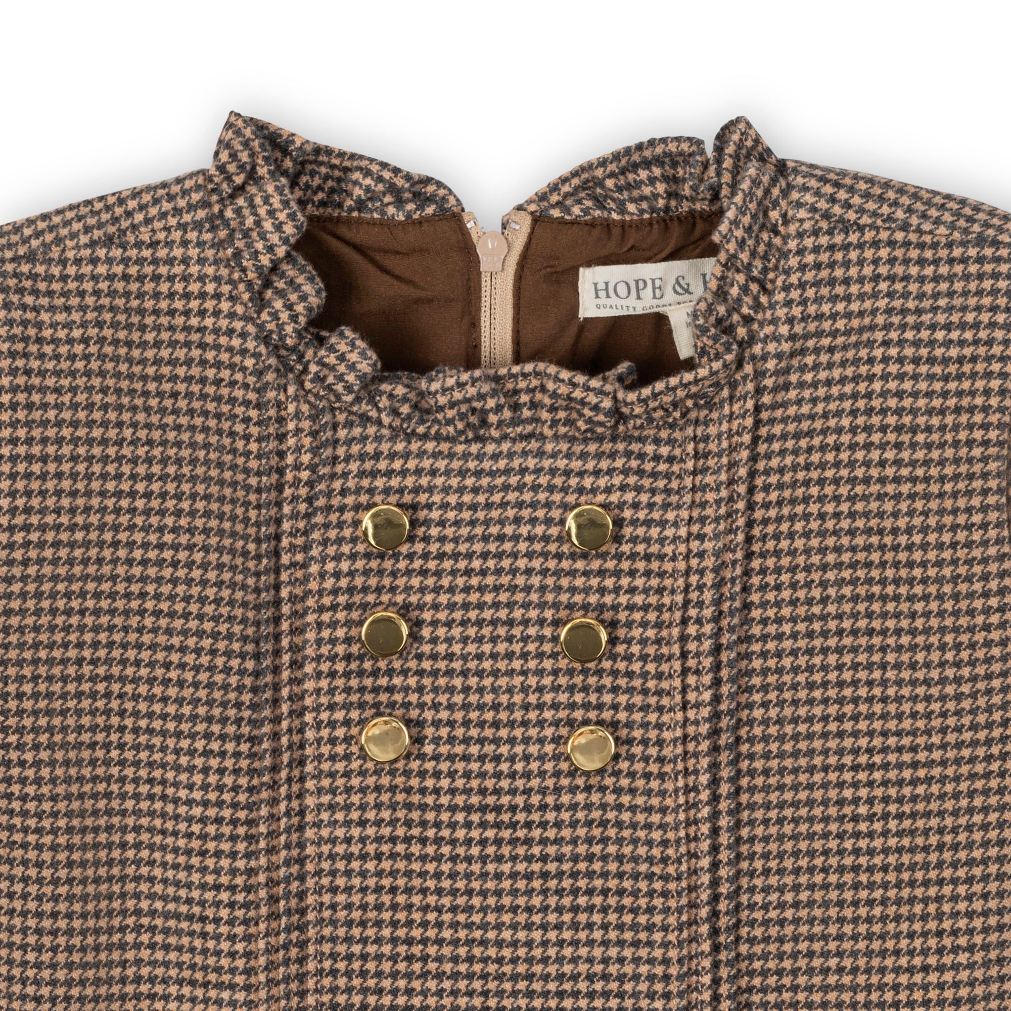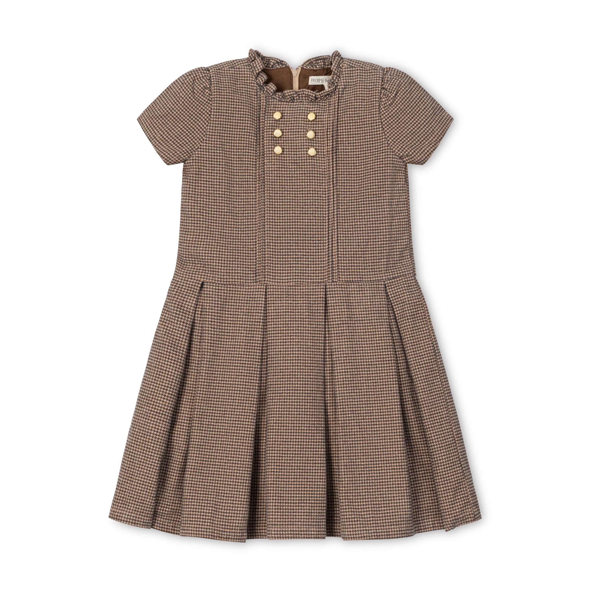 Our sophisticated drop waist dress in soft organic cotton features a ruffle collar to frame her face with simple charm. Features gently puffed sleeves, pintuck details and gold buttons at the bodice, a dropped waist, and a pleated skirt. A zipper closure down the center back makes for easy dressing. Paired with tights, this is a polished fall look.