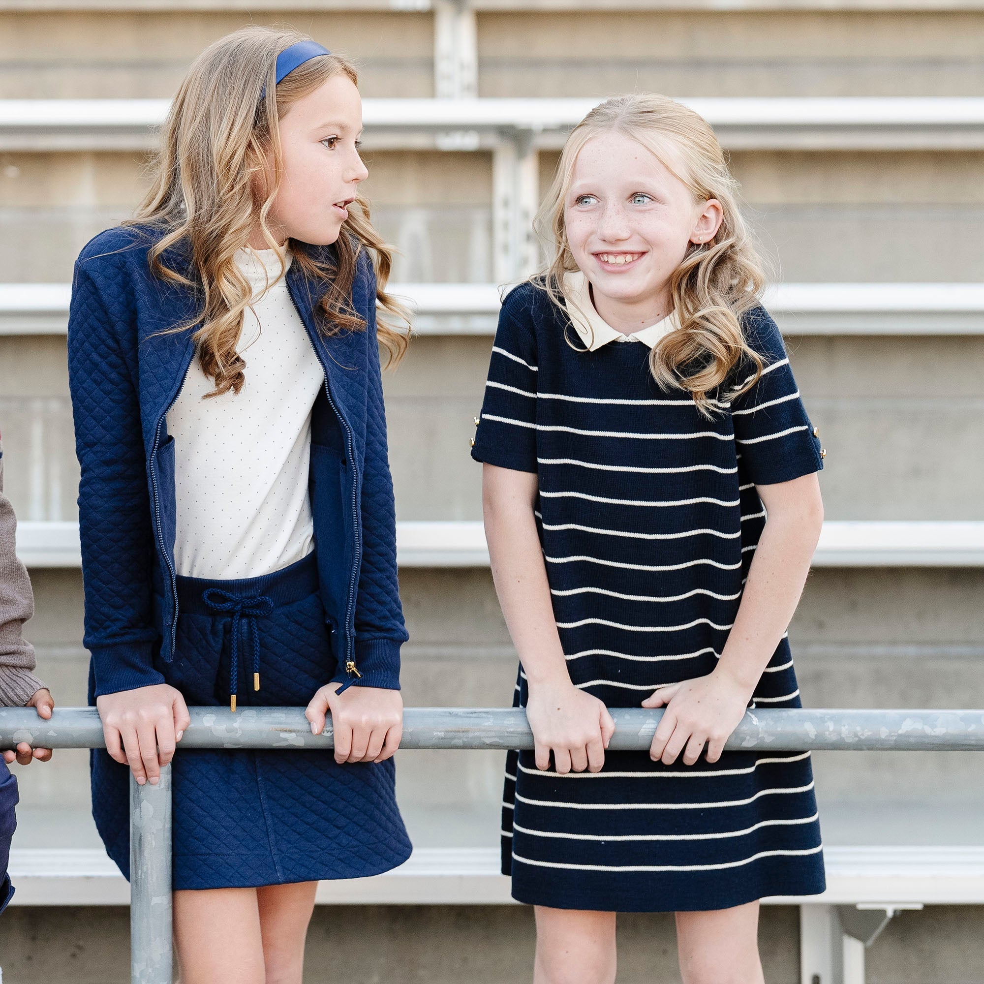 Our sporty quilted skort in a soft organic cotton blend pairs comfort with picture-perfect style. Features an easy pull-on elastic waist, a faux drawcord, and a soft jersey inner short to ensure this look is ready for playtime. Perfect for uniforms and pairs nicely with our collection of organic cotton sweaters and tops.