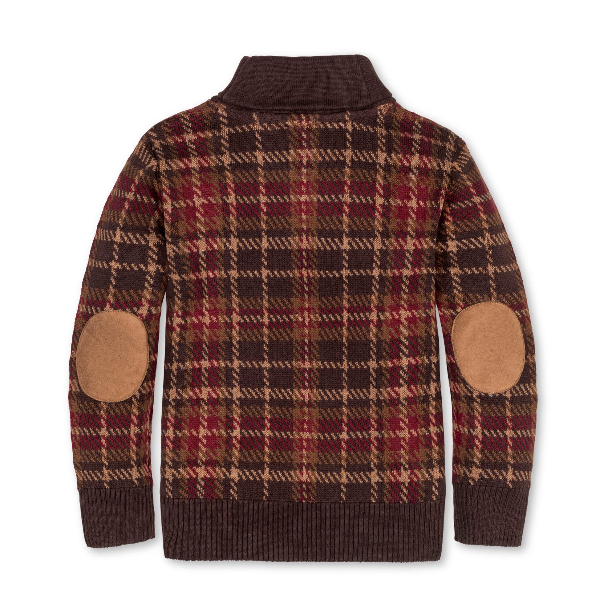 Our shawl collar sweater in soft organic cotton is the ultimate in comfort and style for your boy. Special attention to details such as the shawl collar with button closure, faux suede elbow patches, and allover intarsia design make this an instant classic that can be worn on repeat and handed down time and again.