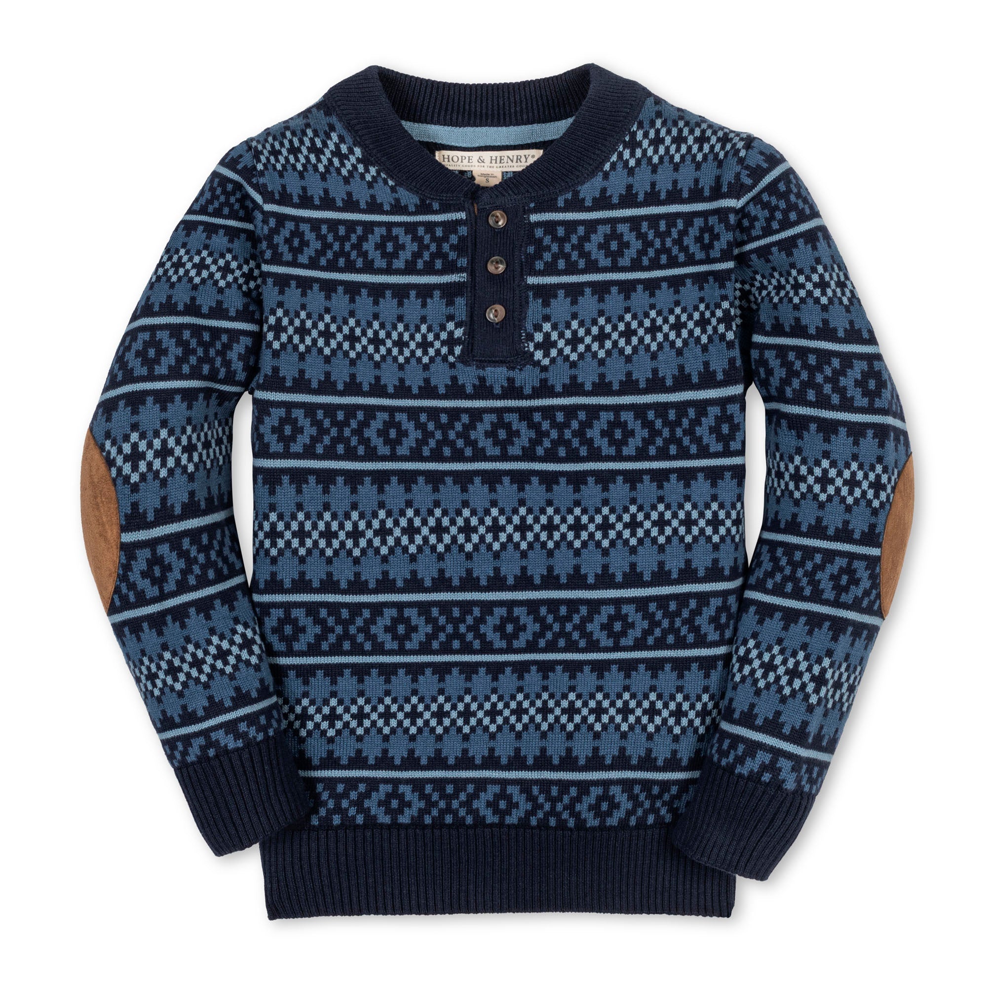 • Henley button placket. Faux suede elbow patches.