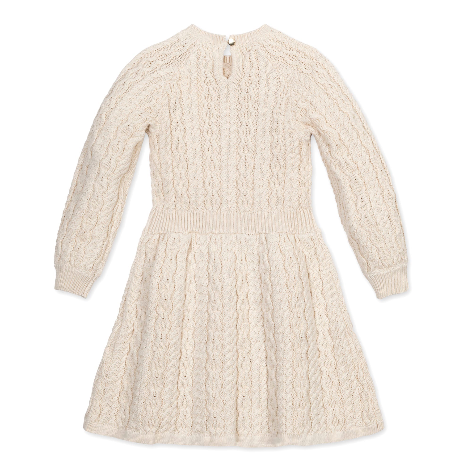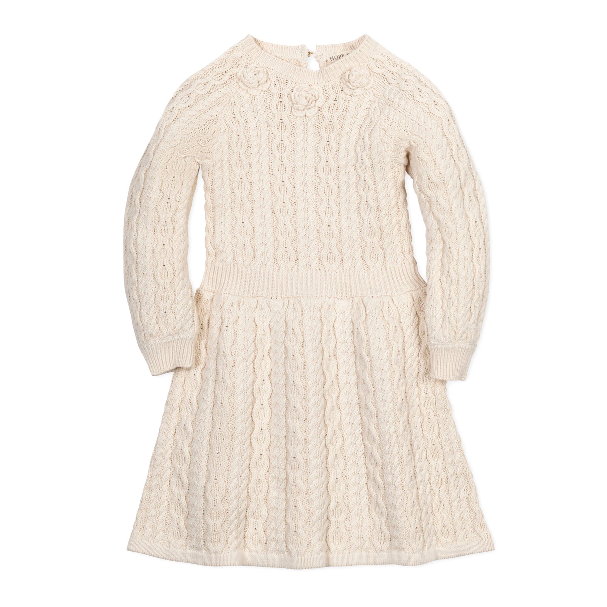 Your girl will be so chic and comfortable in our soft organic cotton cable knit sweater dress. Features a beautiful allover stitch, hand knit rosettes at the neckline, comfry raglan sleeves, and a gold button at the back keyhole closure. An absolutely darling look that is perfect for the holidays and beyond.