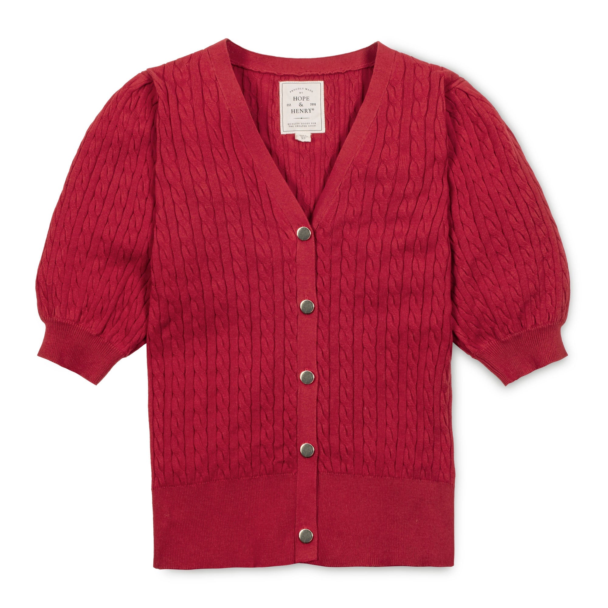Keep it simple yet chic in our button front pointelle sweater. Features a flattering v-neckline paired with a delicate cable knit and soft bubble sleeves. Works just as well for the office as it does for date night or weekend brunch.