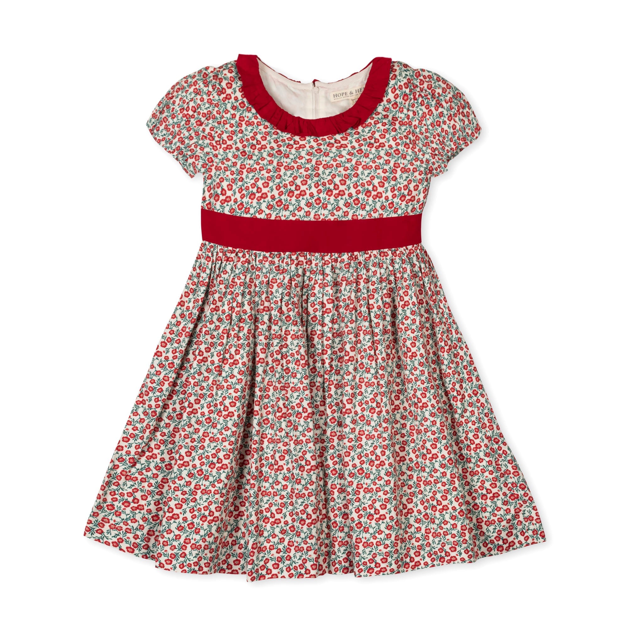 Our playful special occasion dress in soft organic cotton sateen has all the incredible details that make it perfect for everything from dinner with the family to twirling on a dance floor. Features puff sleeves, a beautiful contrast ruffle collar and waist sash with bow, and zipper closure down the back. Fully lined in organic cotton.