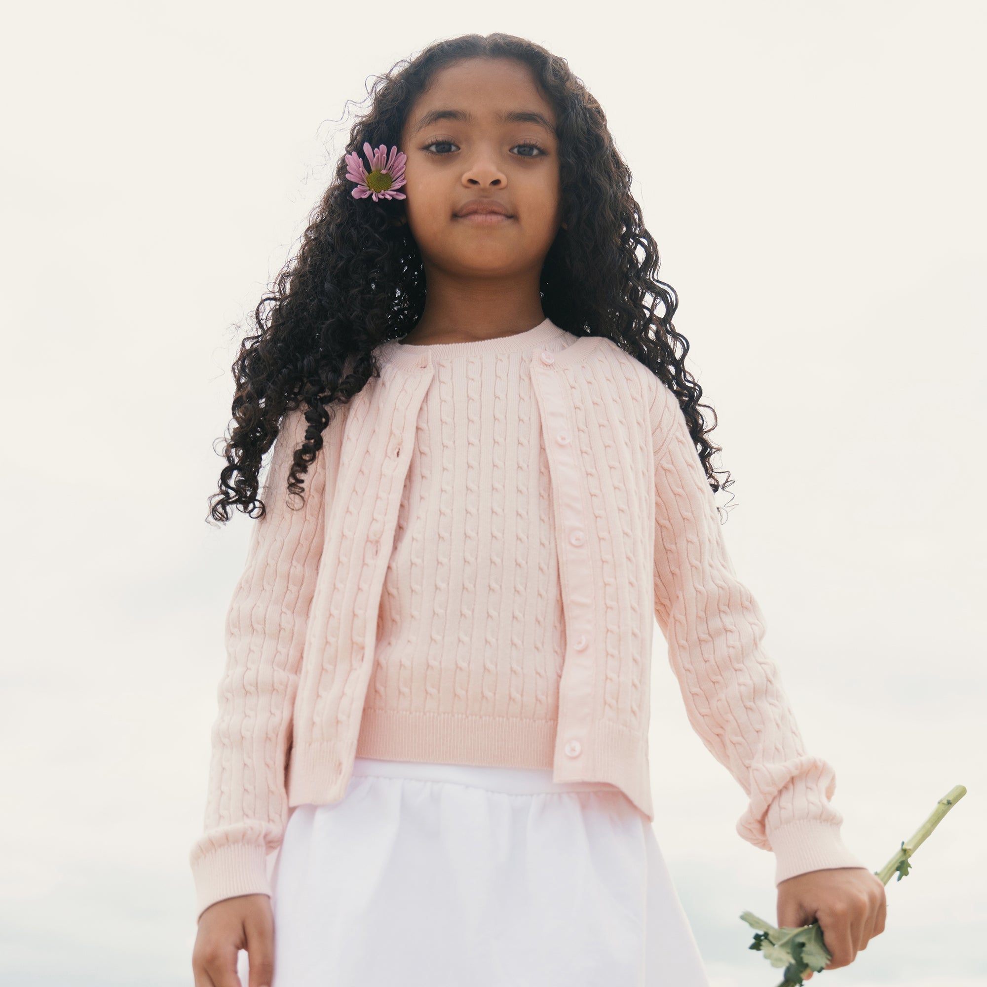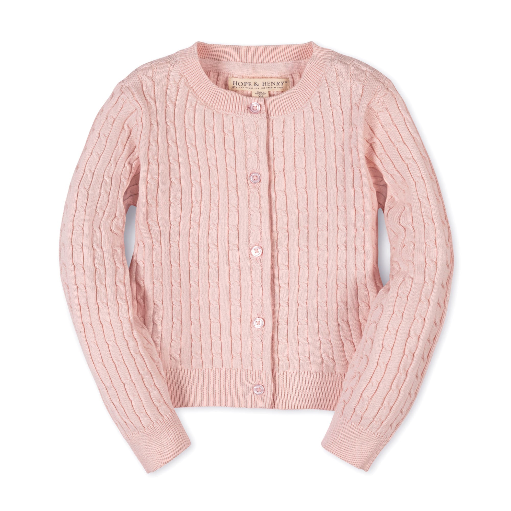 Our adorable classic cable cardigan in soft organic cotton is a sophisticated wardrobe staple for your little lady. This is the piece that layers perfectly with anything from a dressy dress, to a school uniform, to t-shirt and jeans! Features buttons at the center front and an allover cable knit texture.