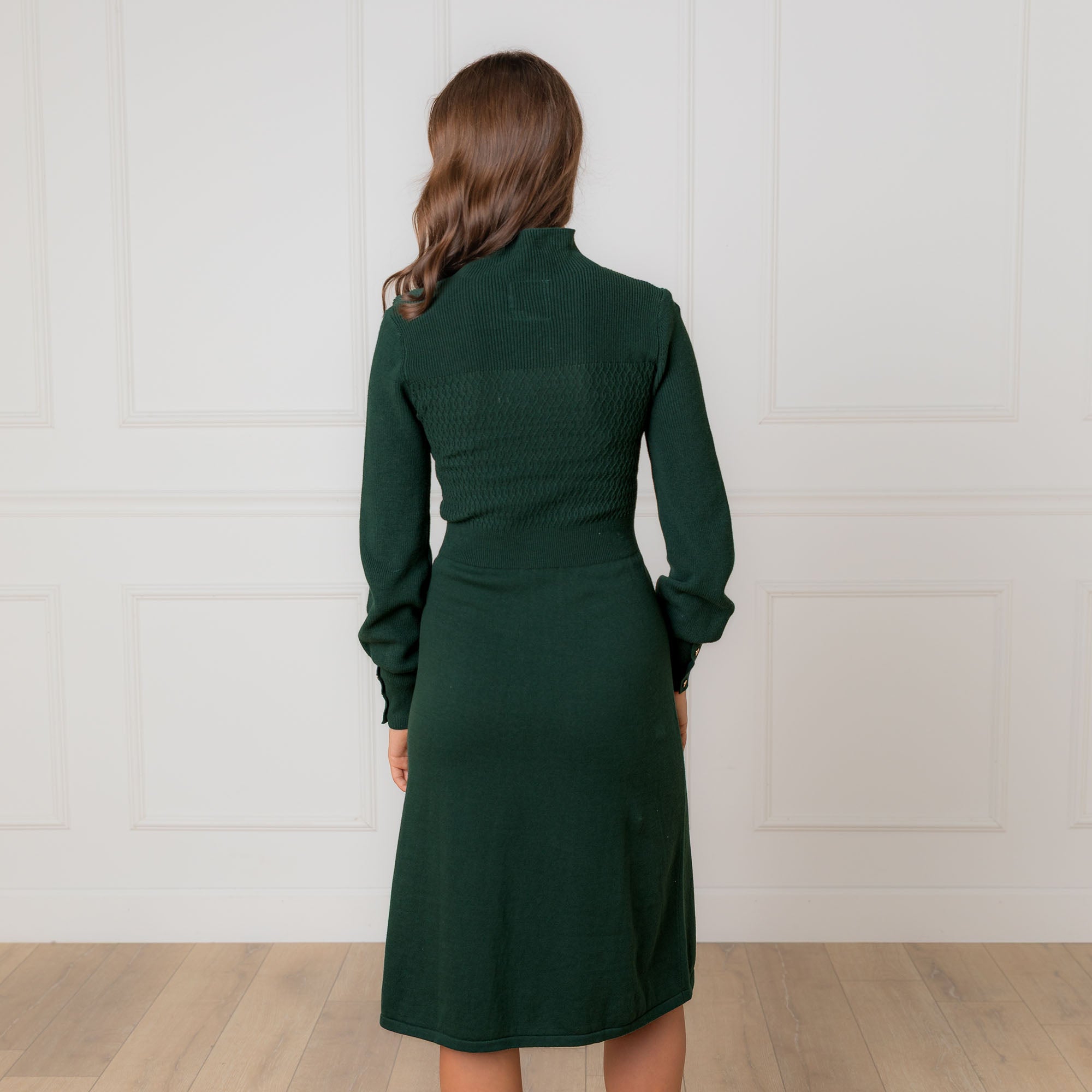 Effortlessly chic is the best way to describe our beautiful mock neck sweater dress crafted from soft organic cotton. Features a textured stitch at the bodice, comfortable mock neck, and gold button details at the cuffs. This is the one you'll be wearing all season long.