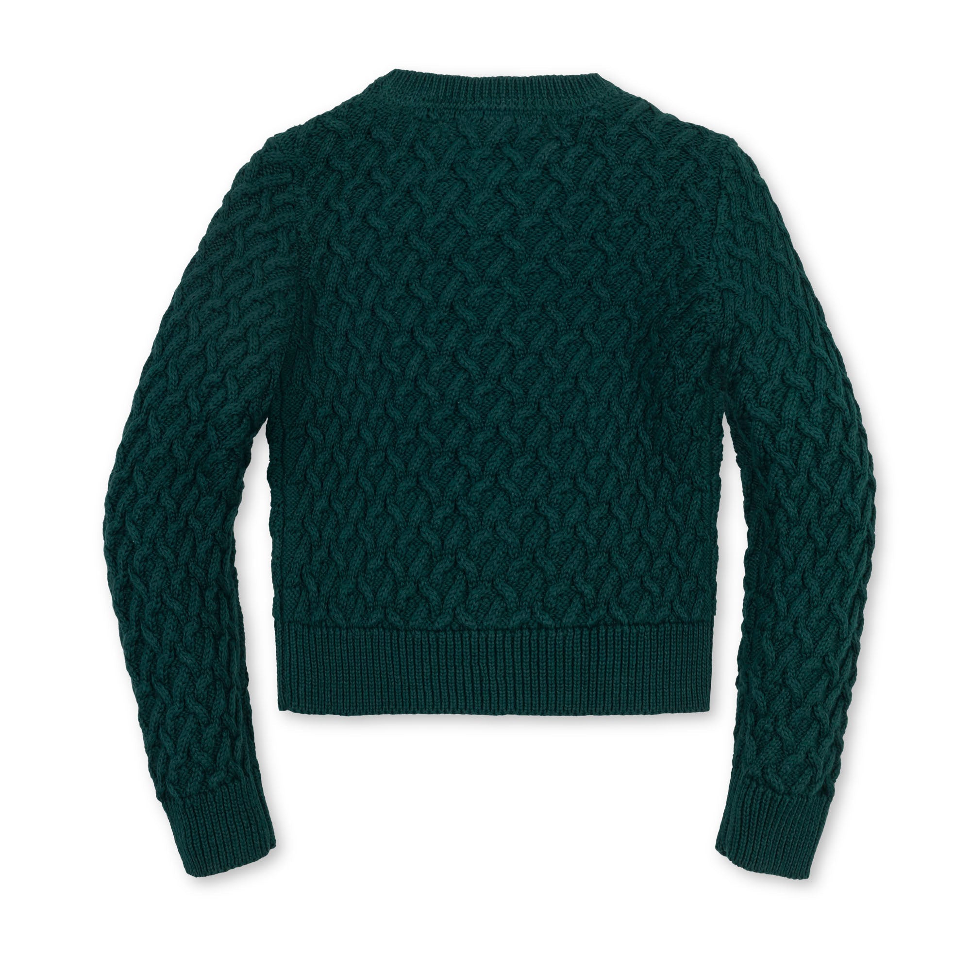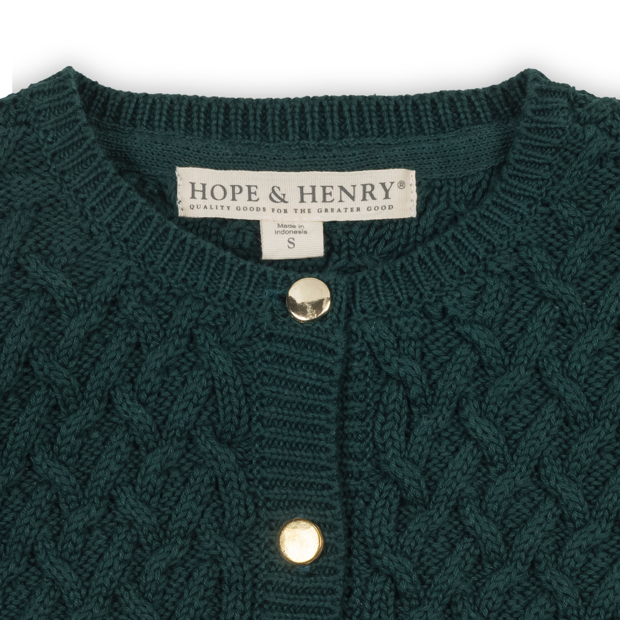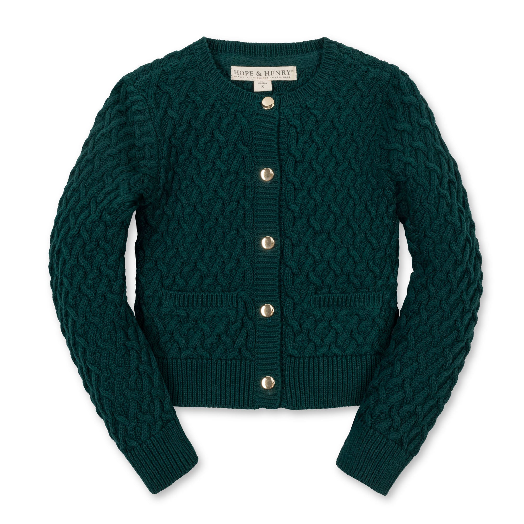 Our beautiful classic cardigan in soft organic cotton is a sophisticated wardrobe staple for your girl. Knit in a lofty herringbone cable, this piece layers perfectly with anything from a dressy dress, to a school outfit, to t-shirt and jeans. Features gold shank buttons at the center front and two sweet little welt pockets.