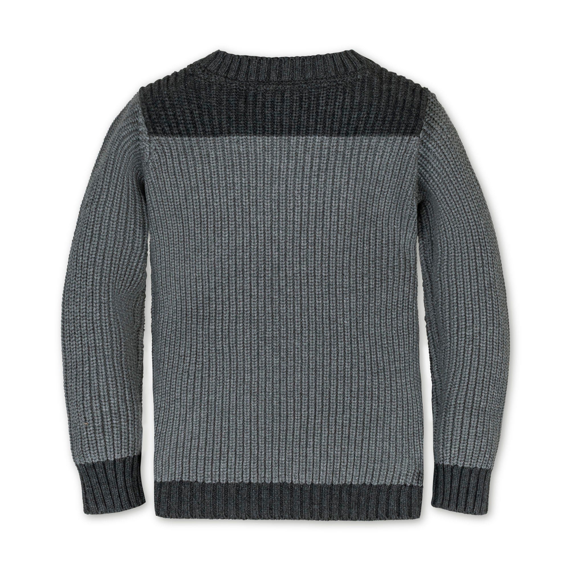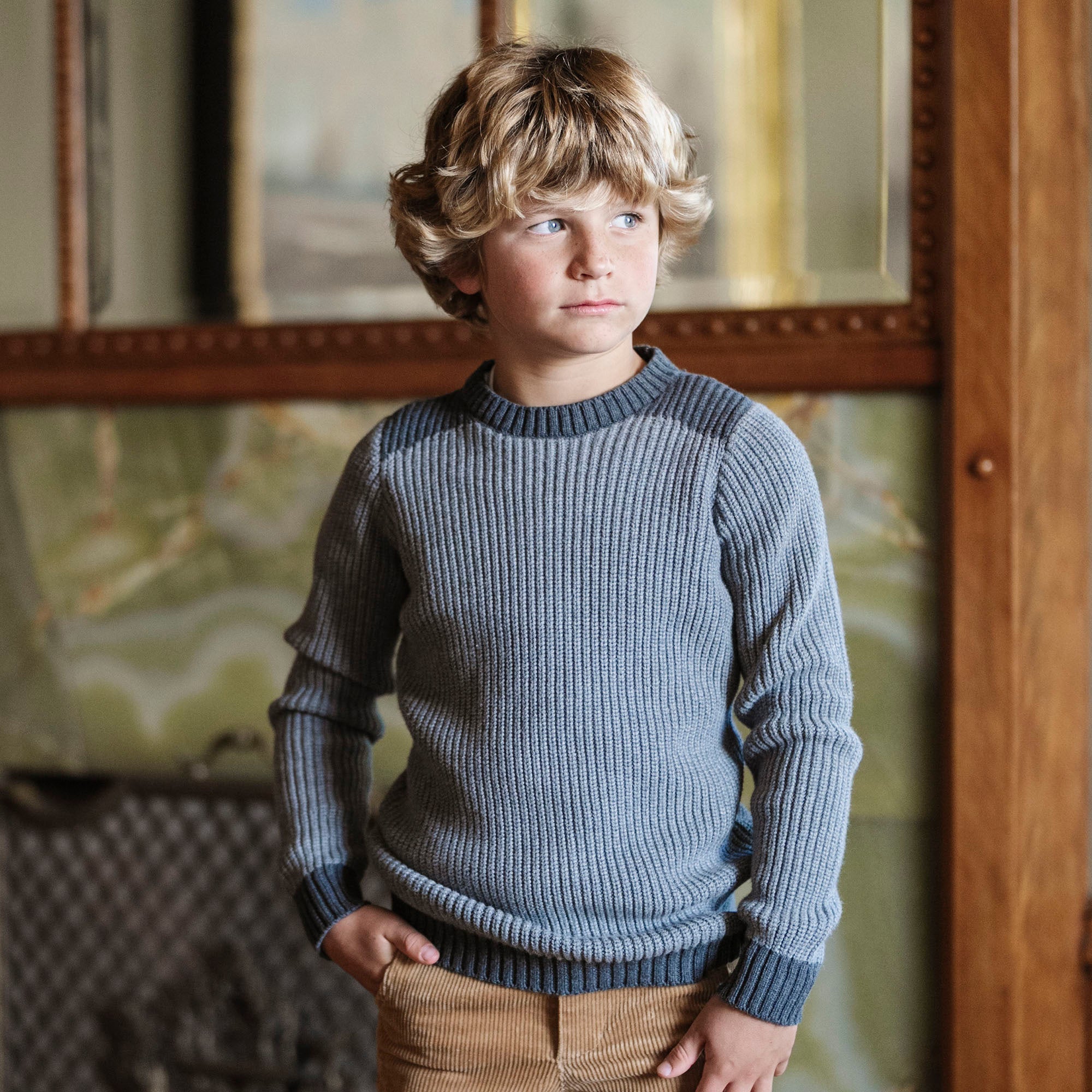 Our stylish crew neck pullover sweater is crafted in soft organic cotton to keep your boy warm all season long. Features contrast piecing at the shoulders with a textured stitch, and rib knit trim at the cuffs and collar. The easy pullover silhouette pairs perfectly with our collection of organic cotton button downs and pants!