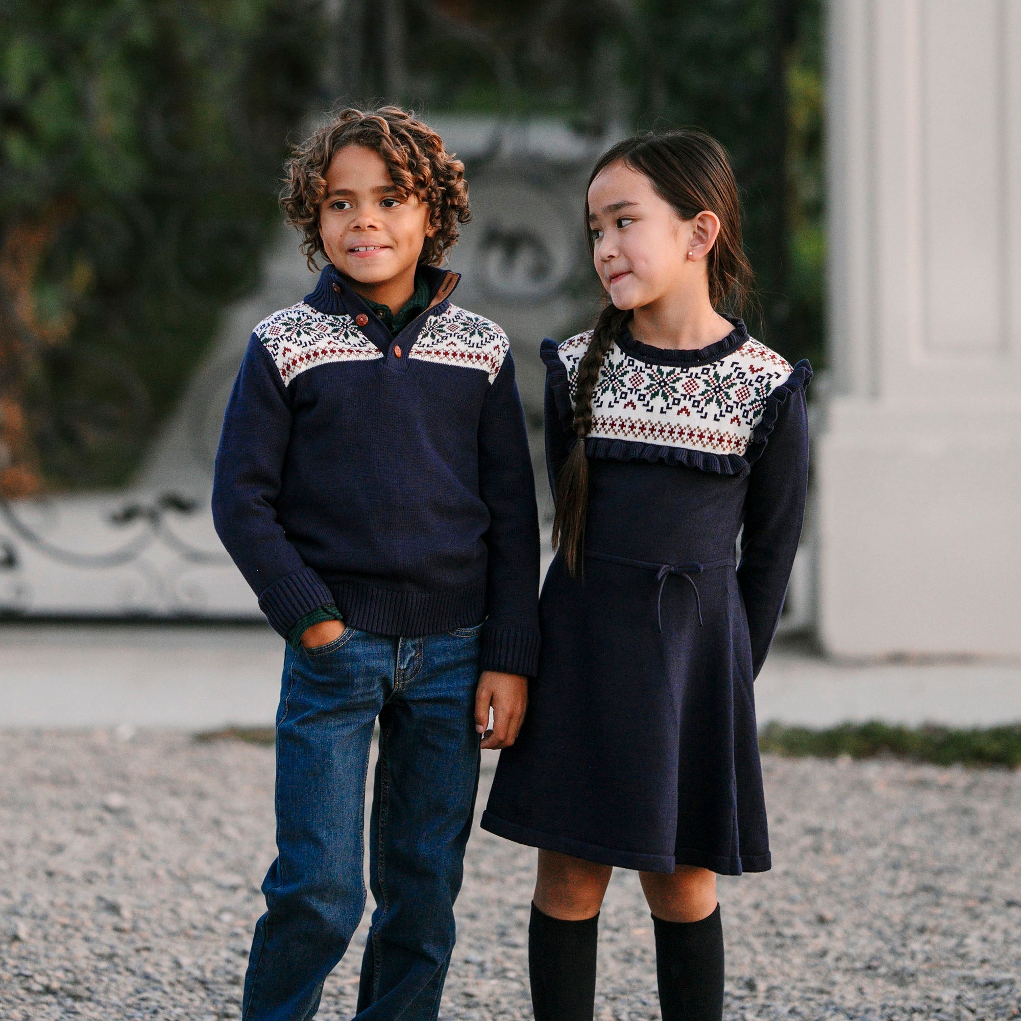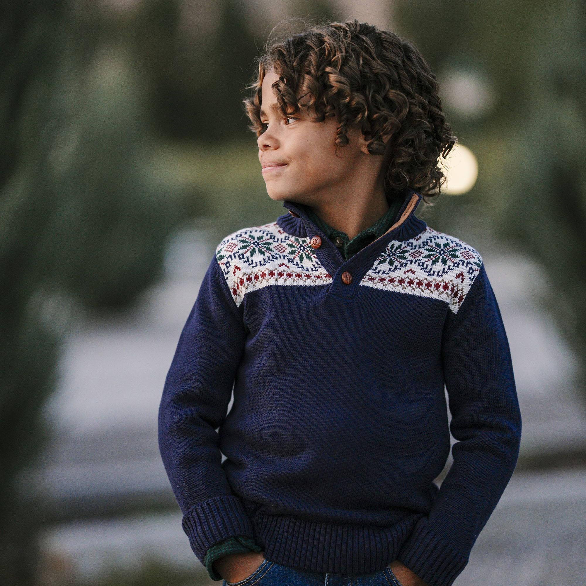 Our plush mock neck sweater in soft organic cotton lends an instantly polished look to your boy for all the activity that cool weather brings. Features a beautiful intarsia design, rib trim, and a button placket with faux suede detail. Pairs perfectly with our collection of organic cotton button downs for a complete look.