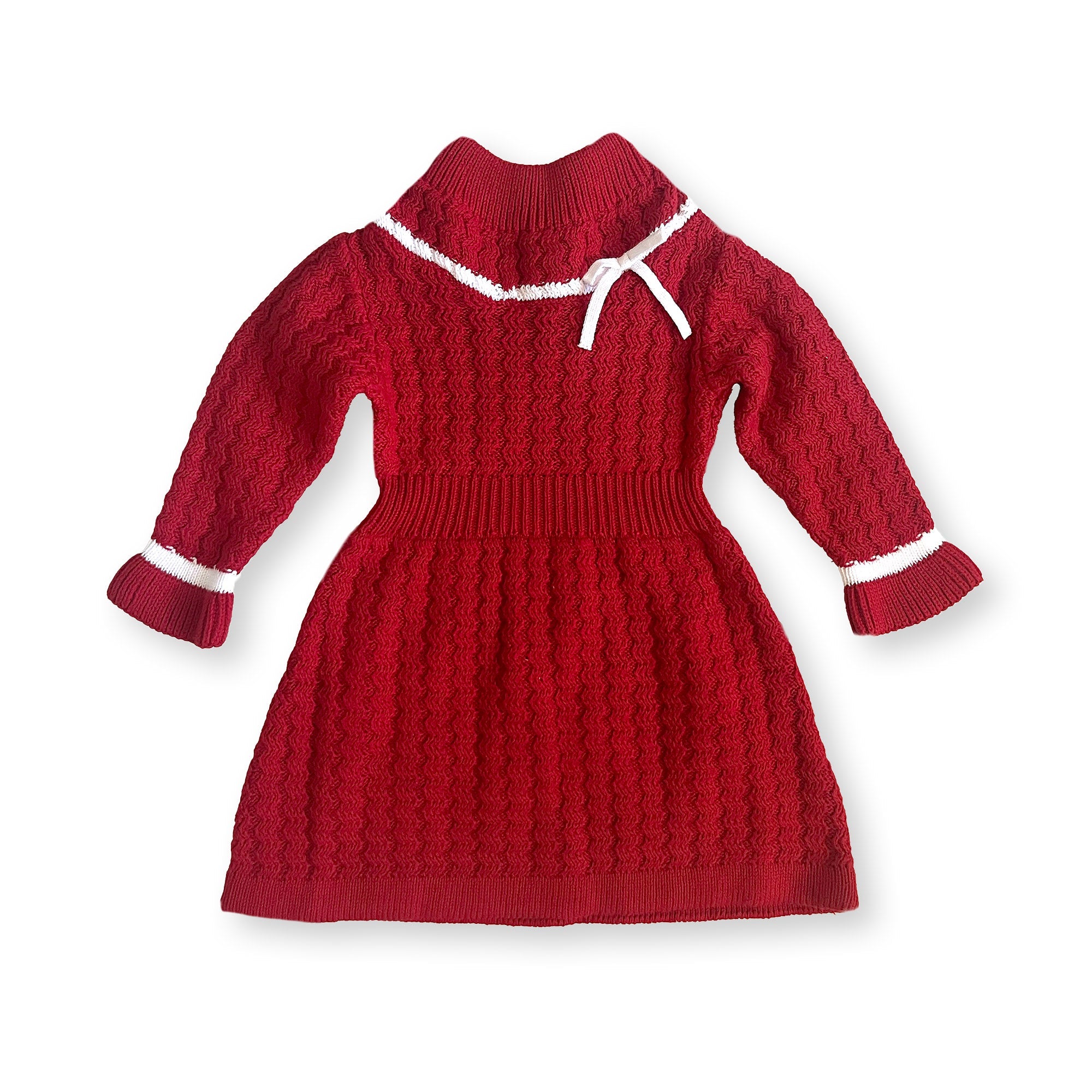 This sophisticated piece combines the polish of a dress with the comfort of her favorite sweater (aka the best of both worlds). Features a cozy mock neck, ruffle cuff, applied bow detail, and beautiful allover cable knit design. A special piece in soft organic cotton with a gold button closure at the center back.