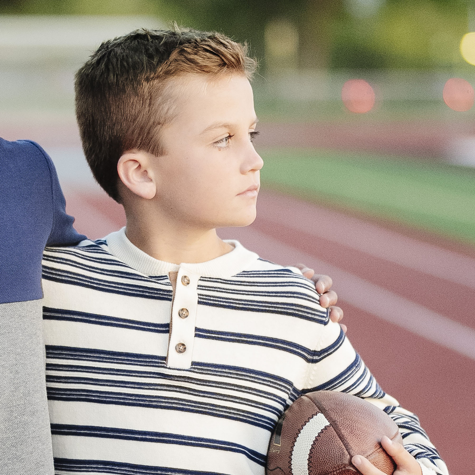• Henley button placket. Faux suede elbow patches.