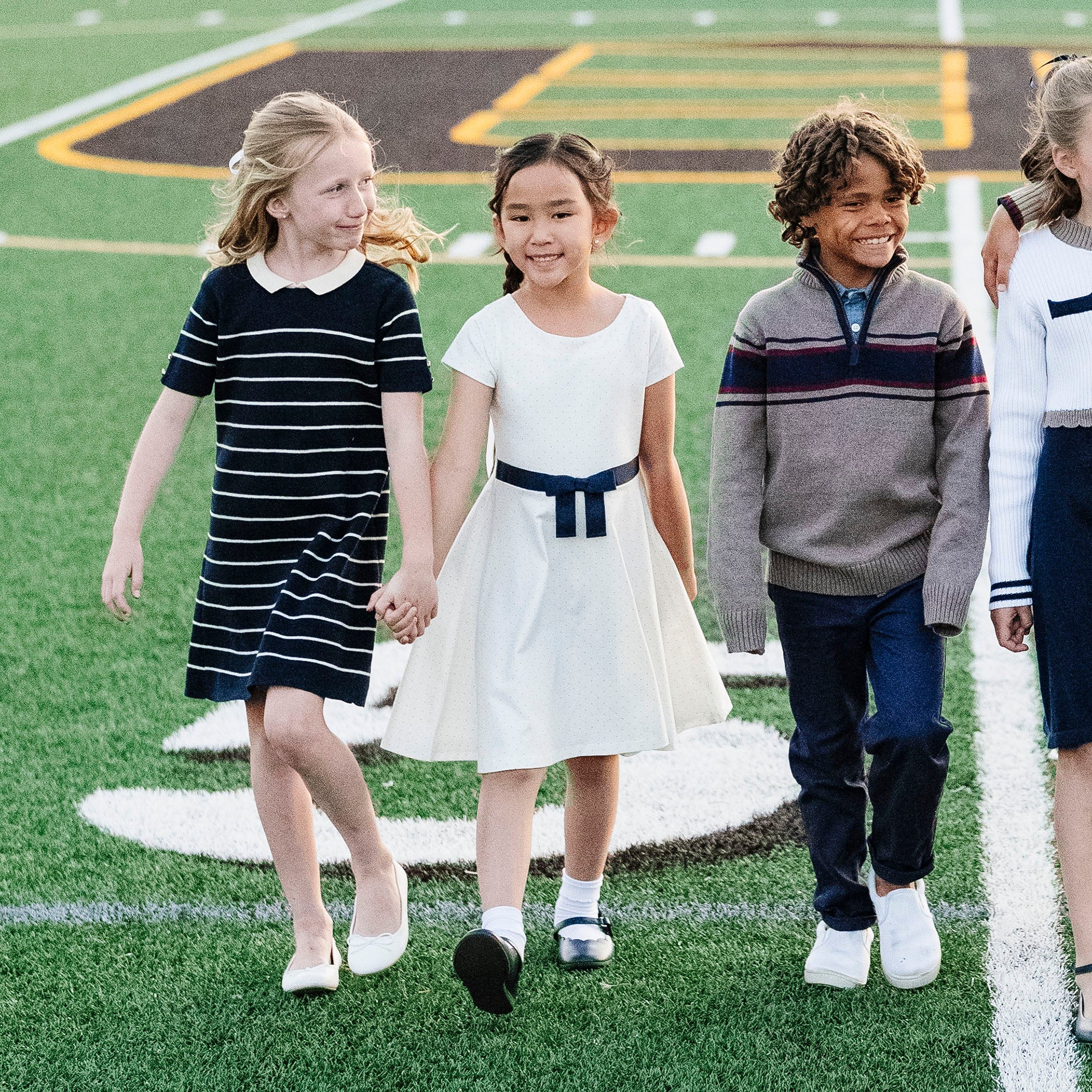 The perfect dress for any occasion! Our French-inspired skater dress is cut in a soft and stretchy organic cotton jersey blend in an easy pullover silhouette. Features a bow detail at the waist, gold button keyhole closure at the back neck, and a flattering fit and flare silhouette for the ultimate twirl factor.